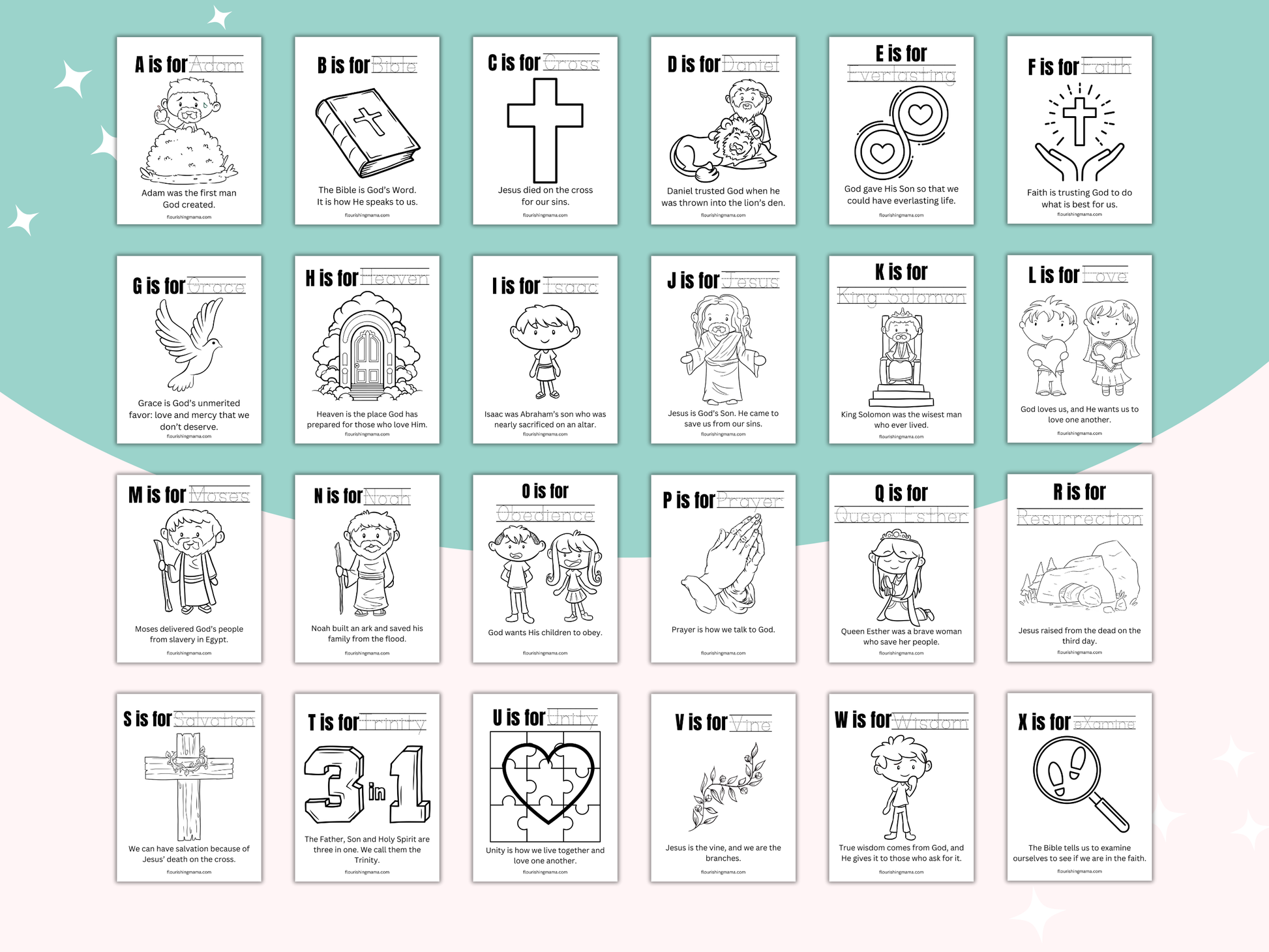 Kids learn so much through play, and that includes Bible lessons. This coloring book includes 26 pages of coloring and tracing activities using the alphabet to help kids learn about the Bible. You'll get page for each letter of the alphabet with words like Adam, Heaven, Moses, Resurrection and more!