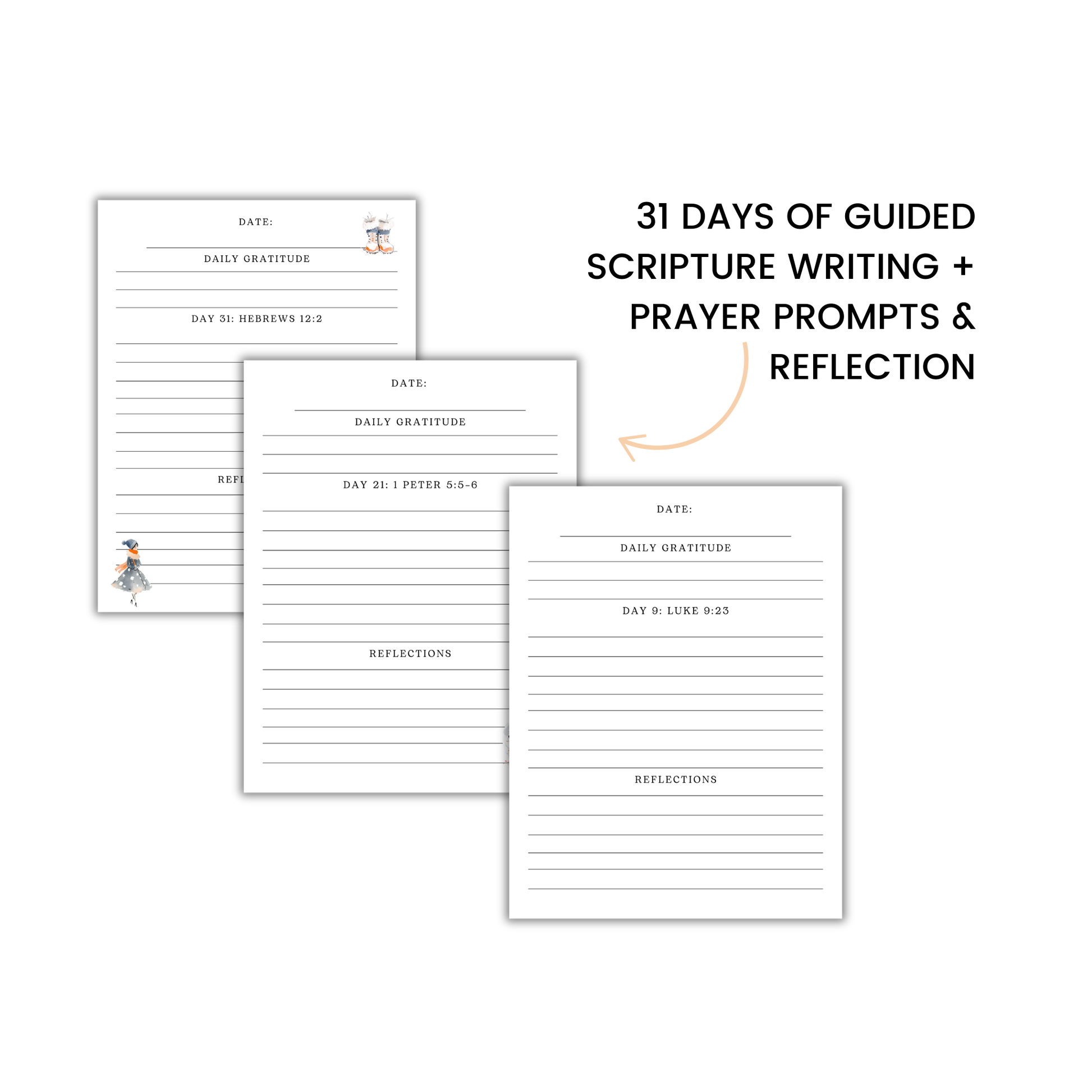 - Guided SOAP format pages (Scripture, Observation, Application, Prayer)
